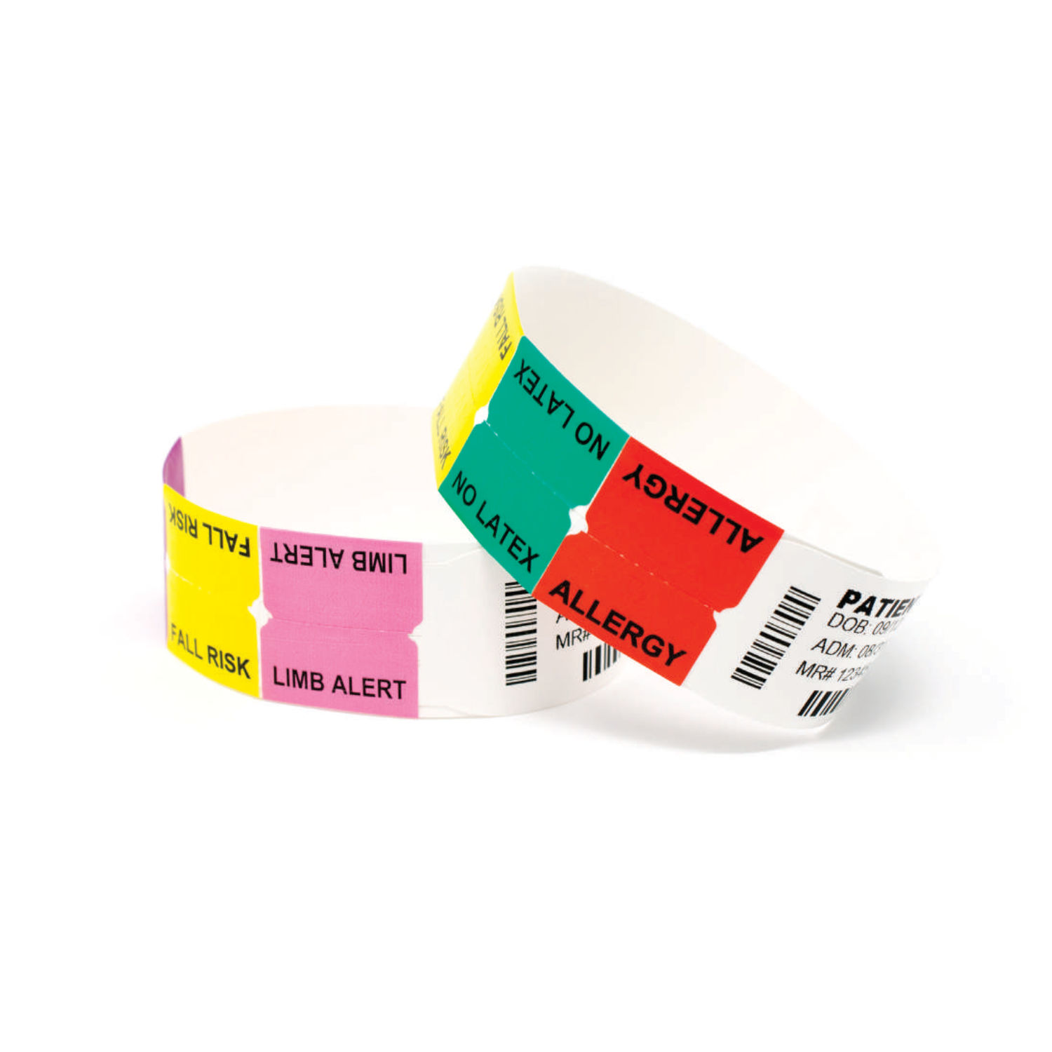Ident-Alert™ Marcadores adhesivos en pulsera de paciente.